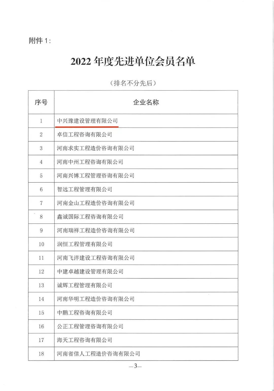 近日,河南省注冊(cè)造價(jià)工程師協(xié)會(huì)公布了“河南省注冊(cè)造價(jià)工程師協(xié)會(huì)2022年度先進(jìn)單位會(huì)員、先進(jìn)個(gè)人會(huì)員的通告”。我公司榮獲河南省注冊(cè)造價(jià)工程師協(xié)會(huì)2022年度先進(jìn)單位會(huì)員榮譽(yù)稱號(hào),徐文、李杰、賈世軍三位同志獲得先進(jìn)個(gè)人會(huì)員的榮譽(yù)。