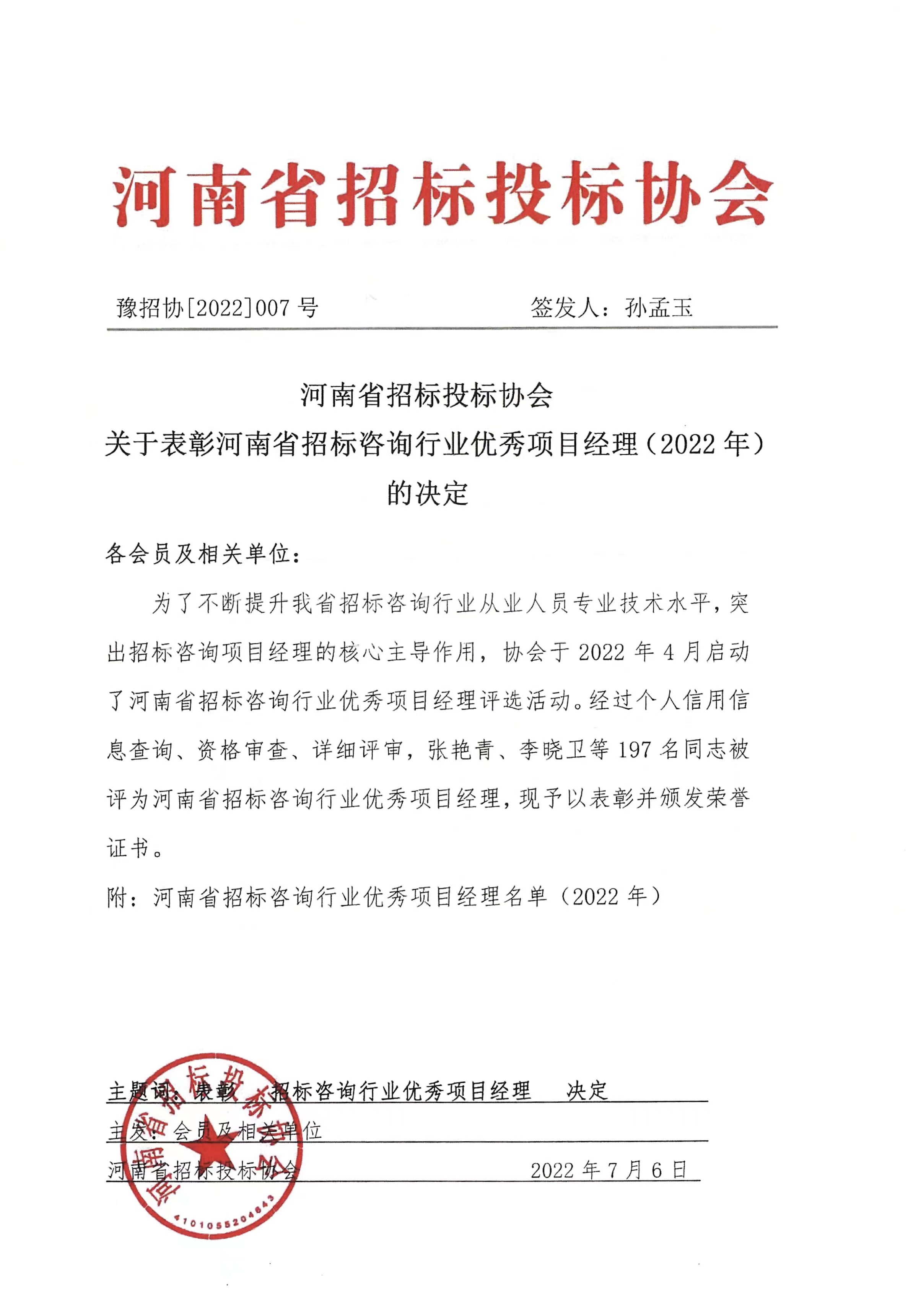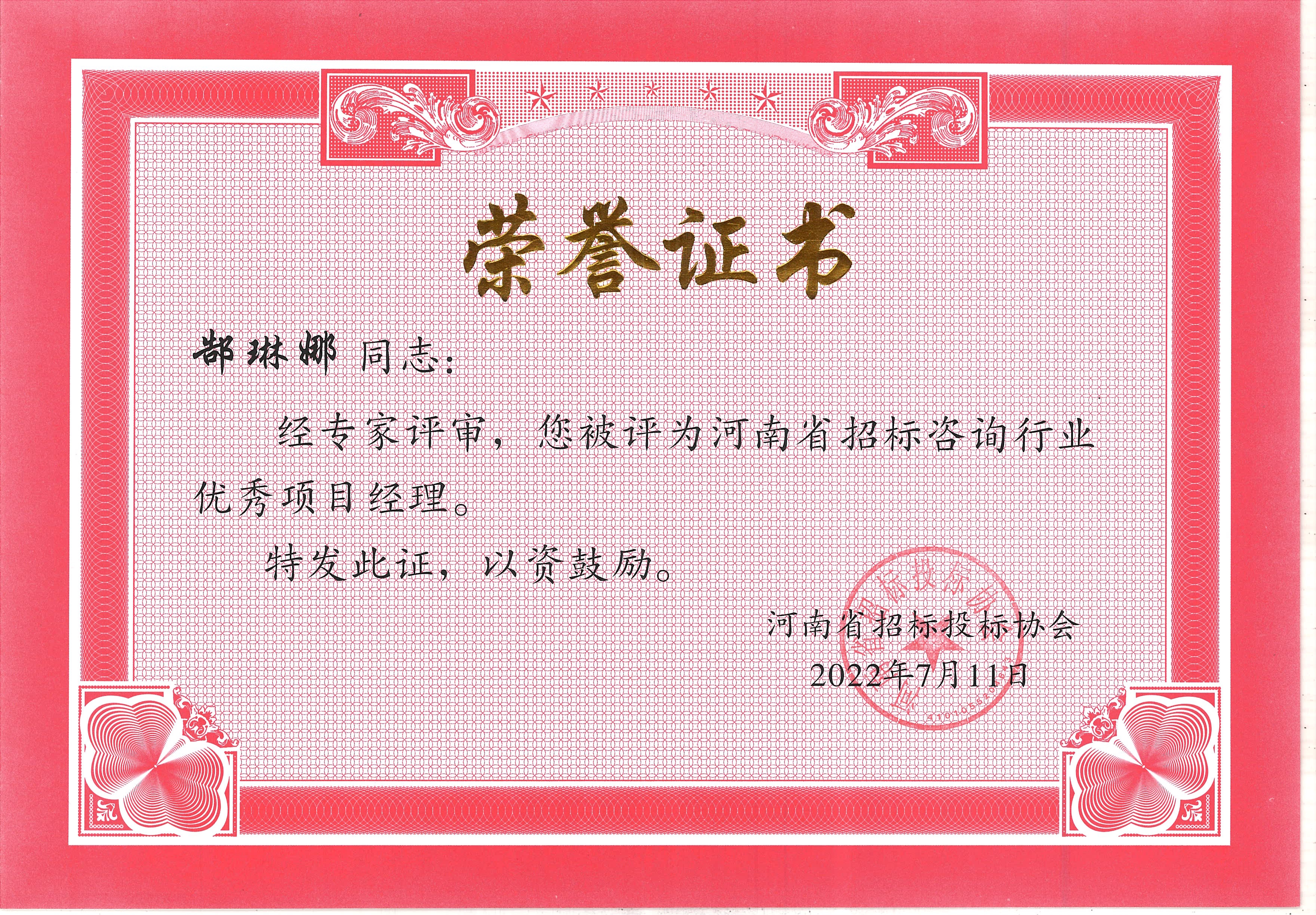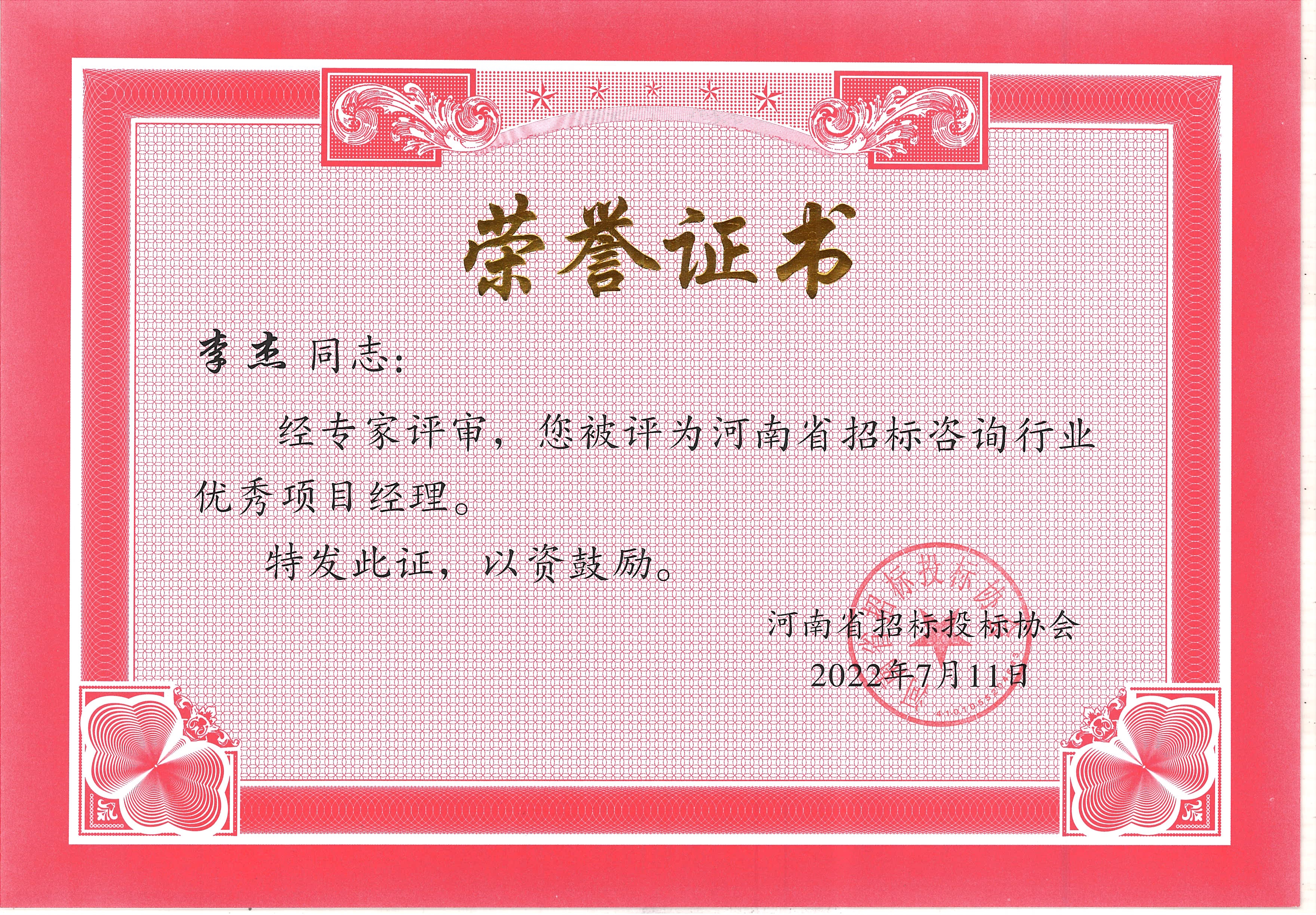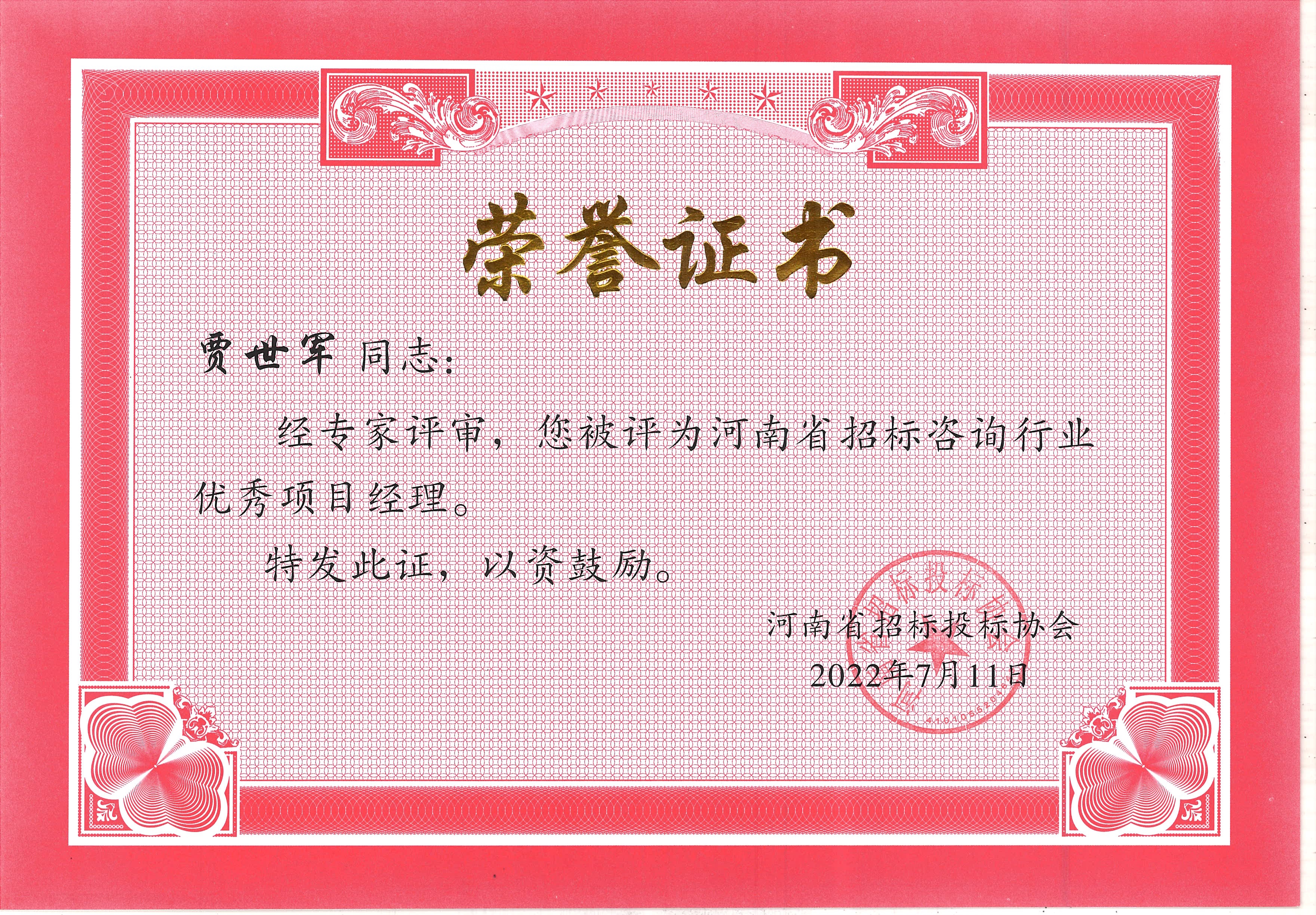 熱烈祝賀我公司張彥令、李杰、石峰、賈世軍、徐海燕、袁明、鄭寧飛、郜琳娜八位同志榮獲河南省招標(biāo)咨詢行業(yè)優(yōu)秀項(xiàng)目經(jīng)理榮譽(yù)稱號。(下附原文)