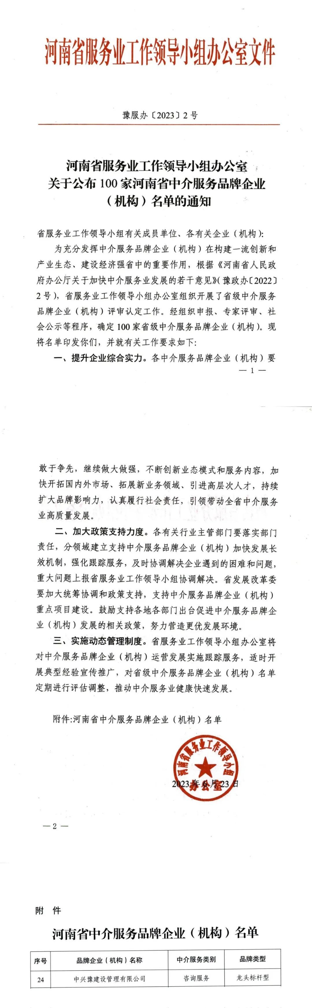 近日,河南省服務業(yè)工作領導小組辦公室公布100家河南省中介服務品牌企業(yè)(機構(gòu))名單。經(jīng)組織申報、專家評審、社會公示等程序,中興豫建設管理有限公司入選其中,被譽為河南省咨詢服務類龍頭標桿型企業(yè)。