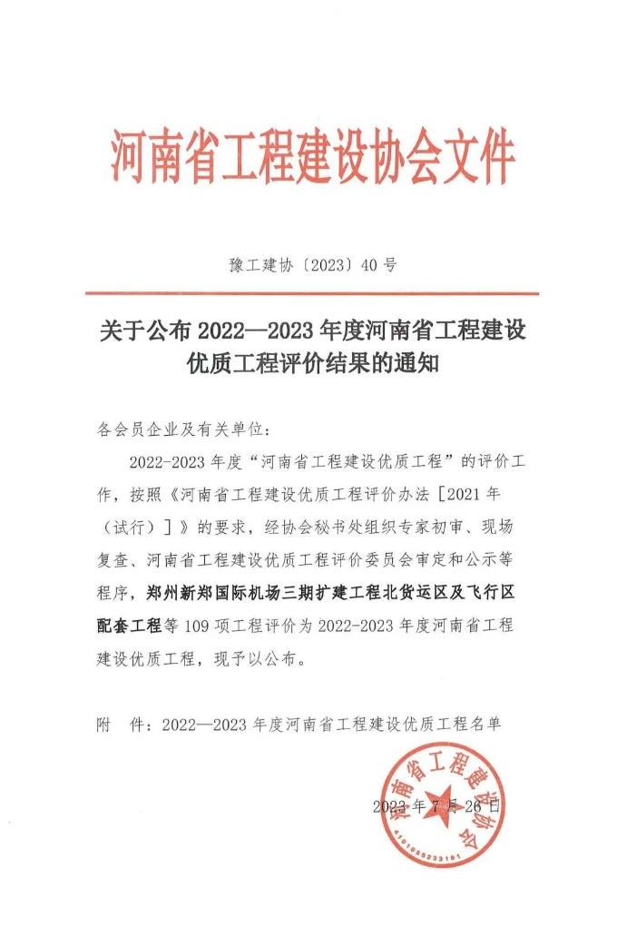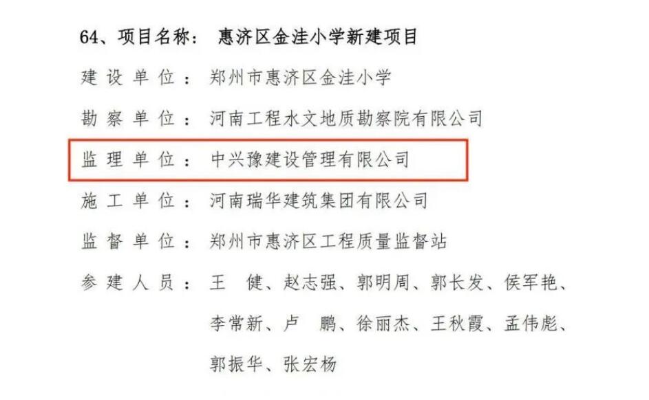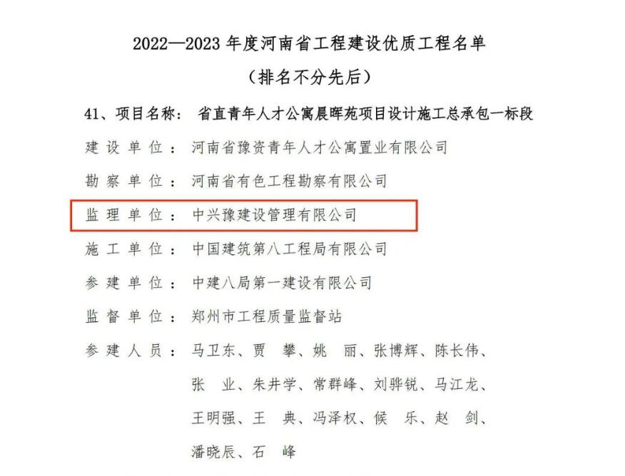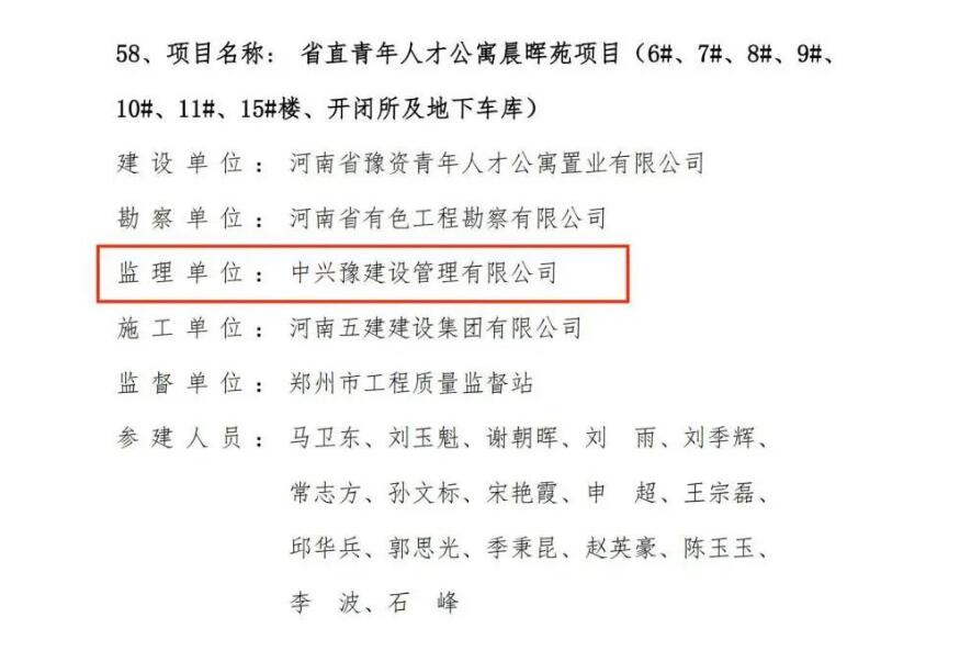 近日,河南省工程建設(shè)協(xié)會公布了“2022-2023年度河南省工程建設(shè)優(yōu)質(zhì)工程評價結(jié)果的通知”,由中興豫建設(shè)管理有限公司擔(dān)任監(jiān)理單位的“省直青年人才公寓晨暉苑項目設(shè)計施工總承包一標(biāo)段”、“省直青年人才公寓晨暉苑項目(6#、7#、8#、9#、10#、11#、15#樓、開閉所及地下車庫)”、“惠濟(jì)區(qū)金洼小學(xué)新建項目”,共三項目齊上榜,紛紛獲得省級榮譽(yù)。