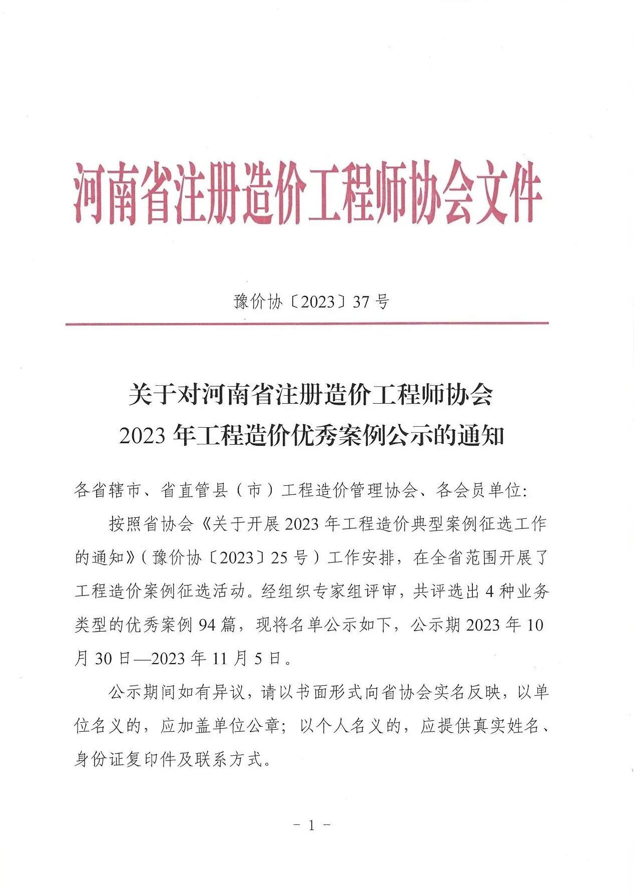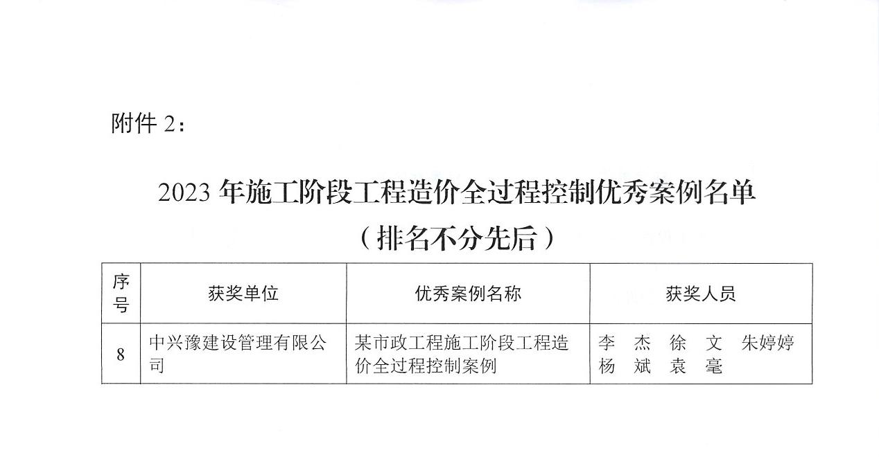10月30日,10月30日,河南省注冊(cè)造價(jià)工程師協(xié)會(huì)公布了“河南省注冊(cè)造價(jià)工程師協(xié)會(huì)2023年工程造價(jià)優(yōu)秀案例公示的通知”,由中興豫建設(shè)管理有限公司負(fù)責(zé)的“某市政工程施工階段工程造價(jià)全過(guò)程控制案例”項(xiàng)目榜上有名。