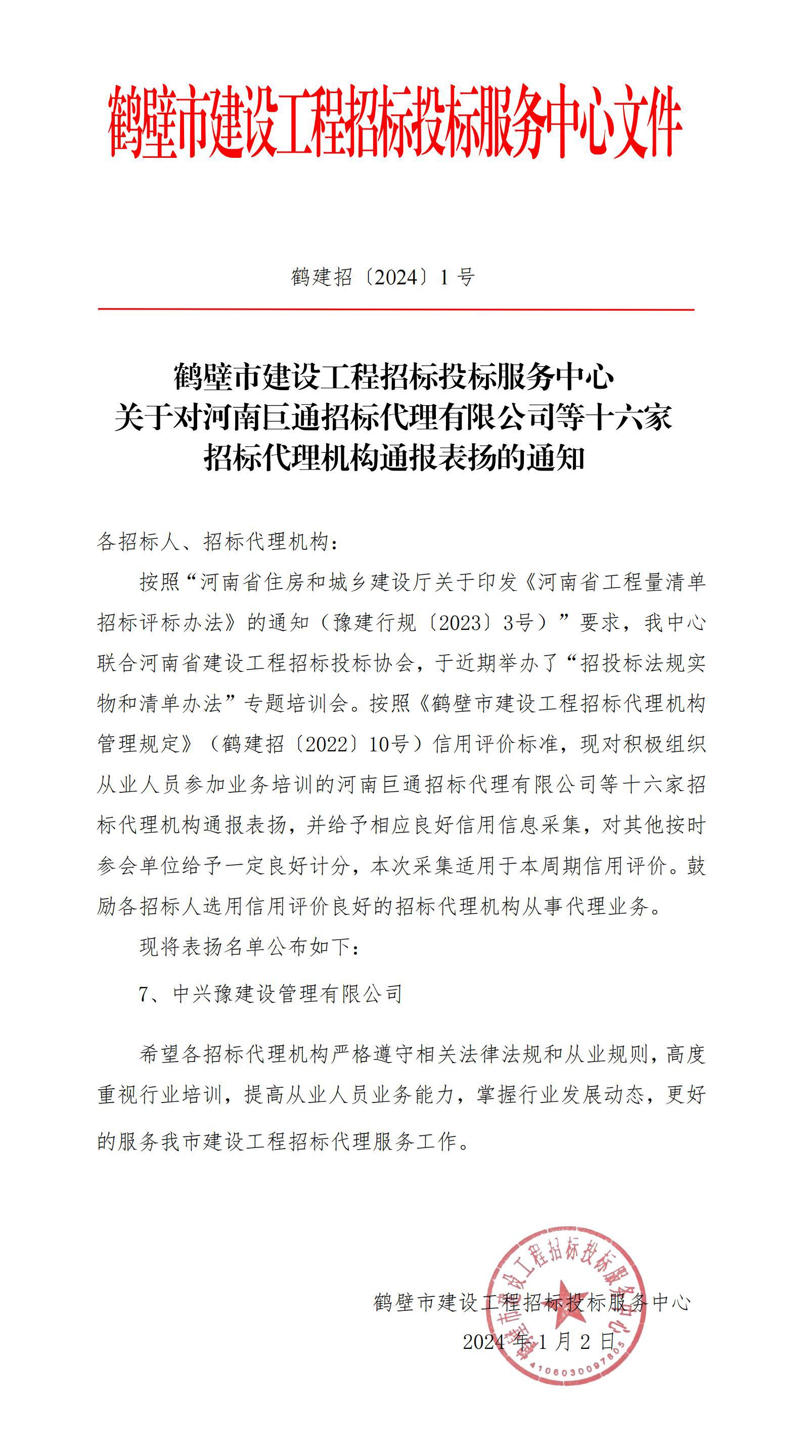 近日,鶴壁市建設(shè)工程招標(biāo)投標(biāo)服務(wù)中心發(fā)布了《關(guān)于對河南巨通招標(biāo)代理有限公司等十六家招標(biāo)代理機(jī)構(gòu)通報表揚的通知》,對積極組織從業(yè)人員參加業(yè)務(wù)培訓(xùn)的代理機(jī)構(gòu)通報表揚,中興豫建設(shè)管理有限公司榜上有名,同時鼓勵各招標(biāo)人選用信用評價良好的招標(biāo)代理機(jī)構(gòu)從事代理業(yè)務(wù)。