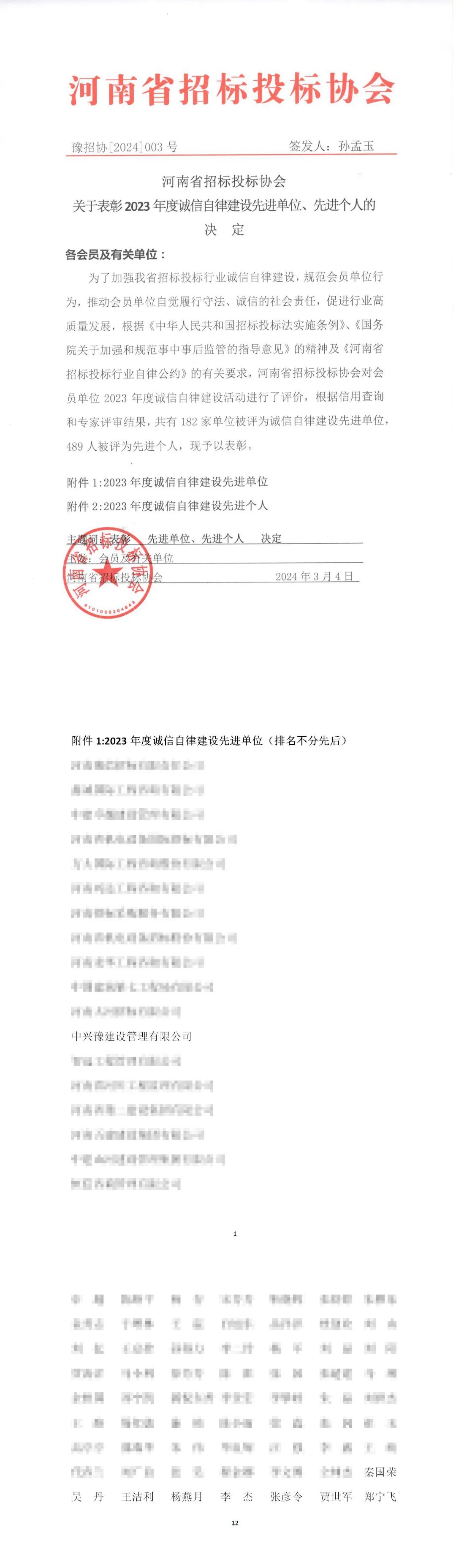 近日,河南省招標投標協(xié)會發(fā)布了《關(guān)于表彰2023年度誠信自律建設(shè)先進單位、先進個人的決定》,中興豫建設(shè)管理有限公司再次榮獲“誠信自律建設(shè)先進單位”,八人榮獲“誠信自律建設(shè)先進個人”榮譽稱號。