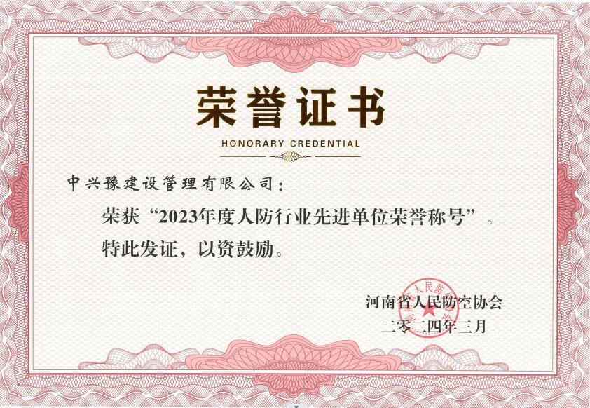 中興豫建設管理有限公司獲此榮譽,是行業(yè)協(xié)會對我公司工作的高度認可與肯定,在今后的發(fā)展中,我們將再接再厲,繼續(xù)發(fā)揮示范引領作用,當好“排頭兵”,秉持“科學公正高效、至誠服務社會”的經(jīng)營理念,積極踐行誠信自律的優(yōu)良作風,不斷提升行業(yè)服務水平,為促進我省人防行業(yè)高質(zhì)量發(fā)展貢獻自身力量!