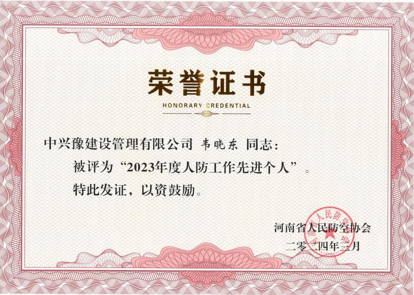 近日,河南省人民防空協(xié)會頒發(fā)了關(guān)于優(yōu)秀會員單位及先進工作者的榮譽證書,我公司核準為河南省人民防空協(xié)會第四屆副會長單位、2023年度人防行業(yè)先進單位,工程監(jiān)理中心總經(jīng)理韋曉東榮獲2023年度人防工作先進個人榮譽稱號。