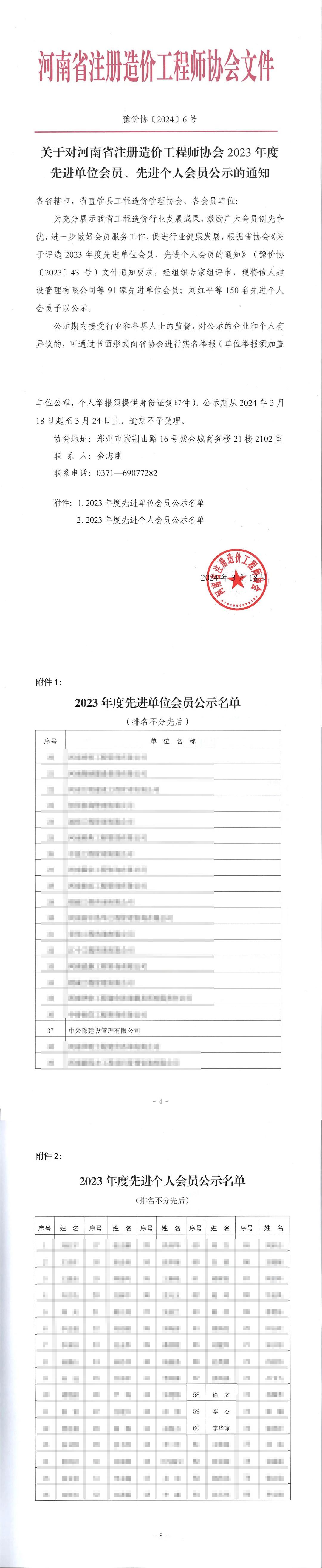 近日,河南省注冊造價工程師協(xié)會公布了《關(guān)于對河南省注冊造價工程師協(xié)會2023年度先進(jìn)單位會員、先進(jìn)個人會員公示的通知》,中興豫建設(shè)管理有限公司榮獲2023年度先進(jìn)單位會員,徐文、李杰、李華瓊榮獲2023年度先進(jìn)個人會員榮譽(yù)稱號!