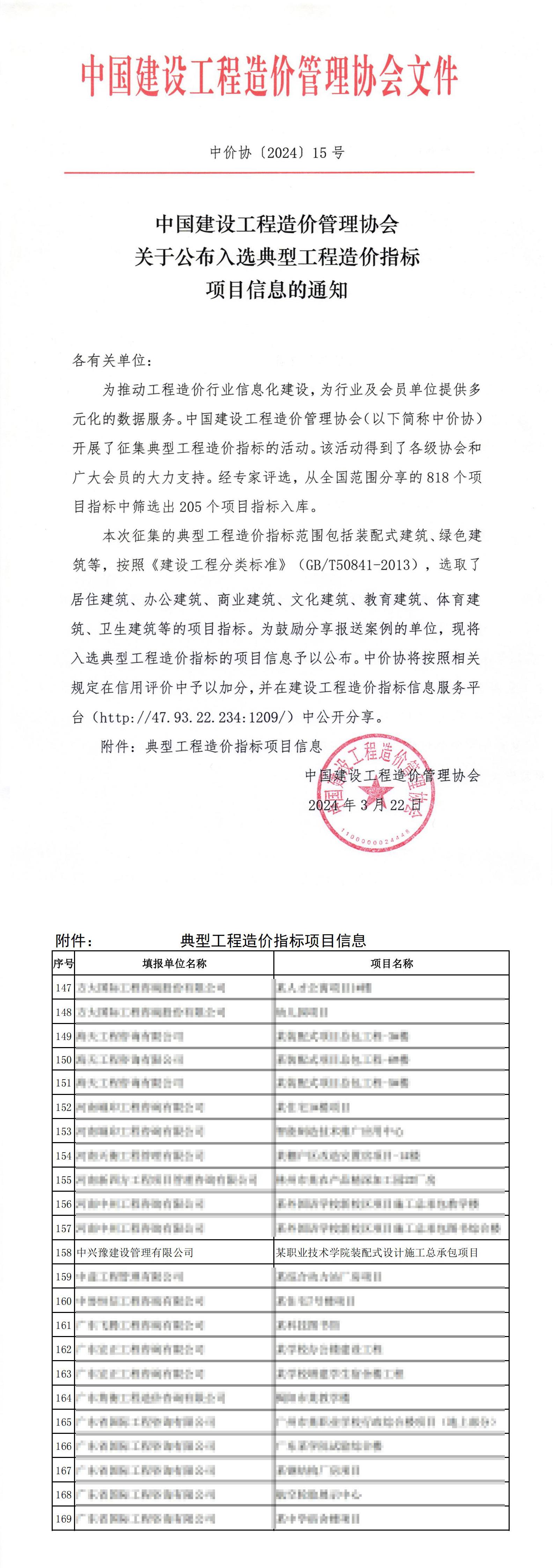 近日,中國建設工程造價管理協(xié)會關于公布入選典型工程造價指標項目信息的通知中,我公司的“某職業(yè)技術學院裝配式設計施工總承包項目"作為典型項目入選其中。