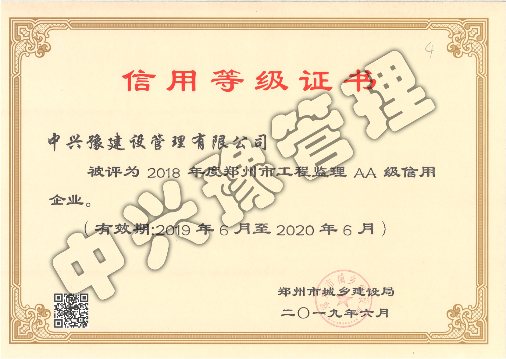2018年度鄭州市工程監(jiān)理AA級(jí)信用企業(yè)-公司榮譽(yù)