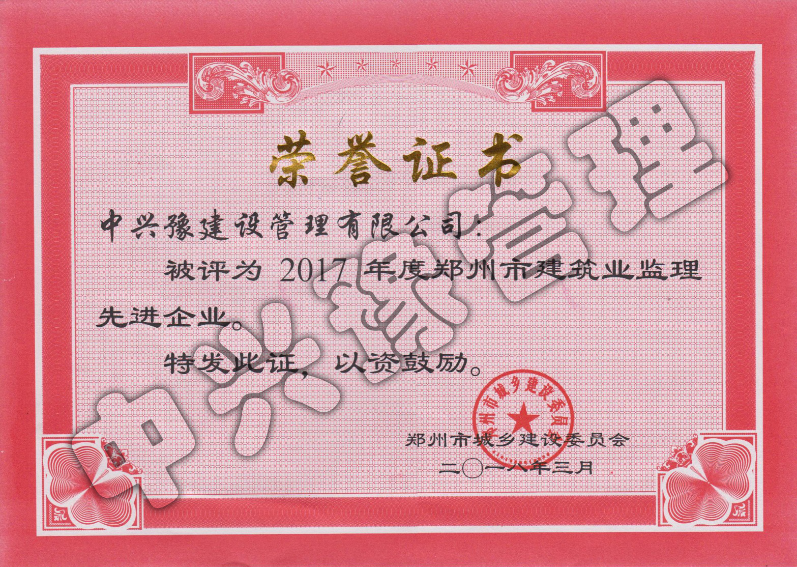 2017年度鄭州市先進(jìn)監(jiān)理企業(yè)-公司榮譽(yù)